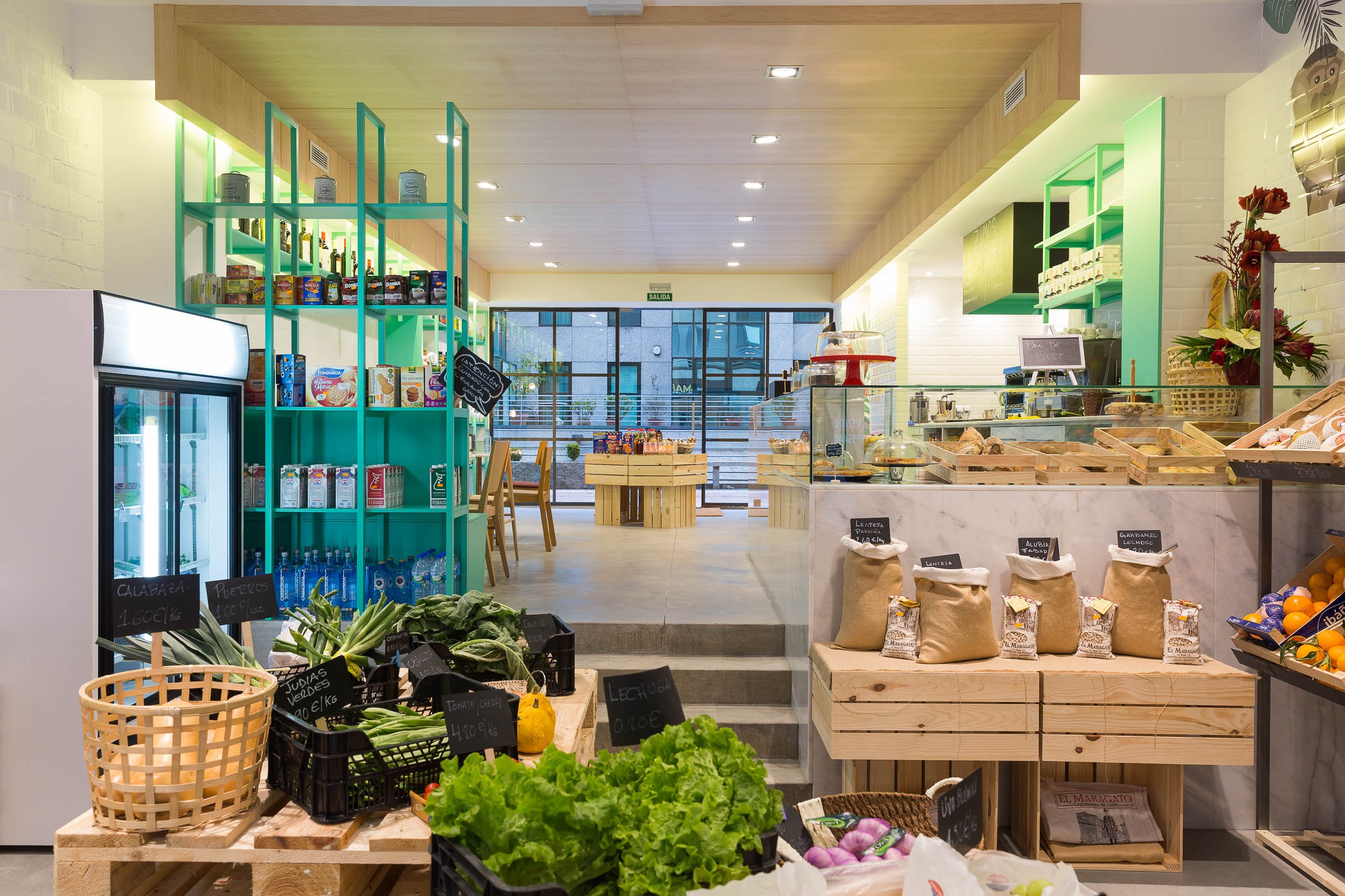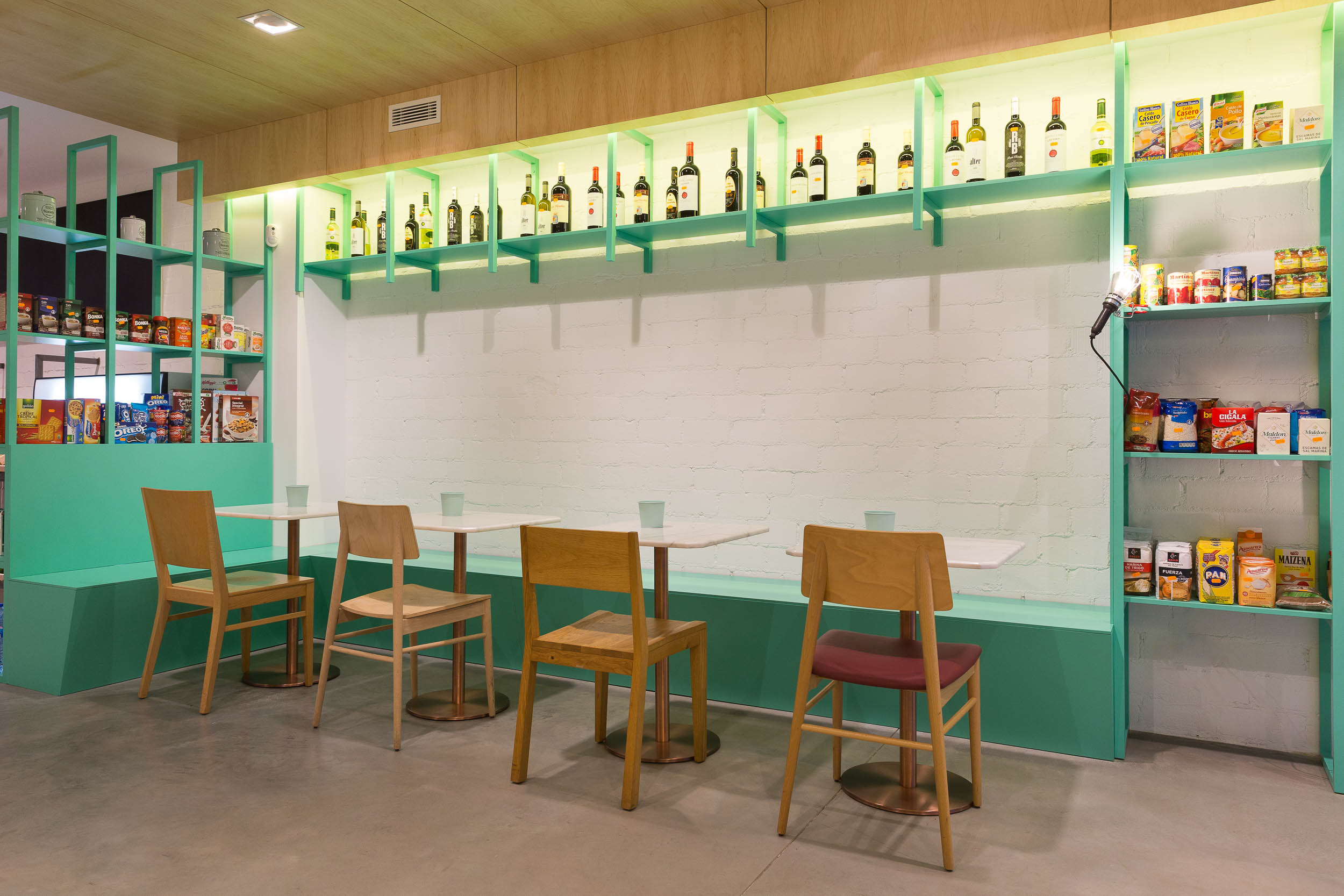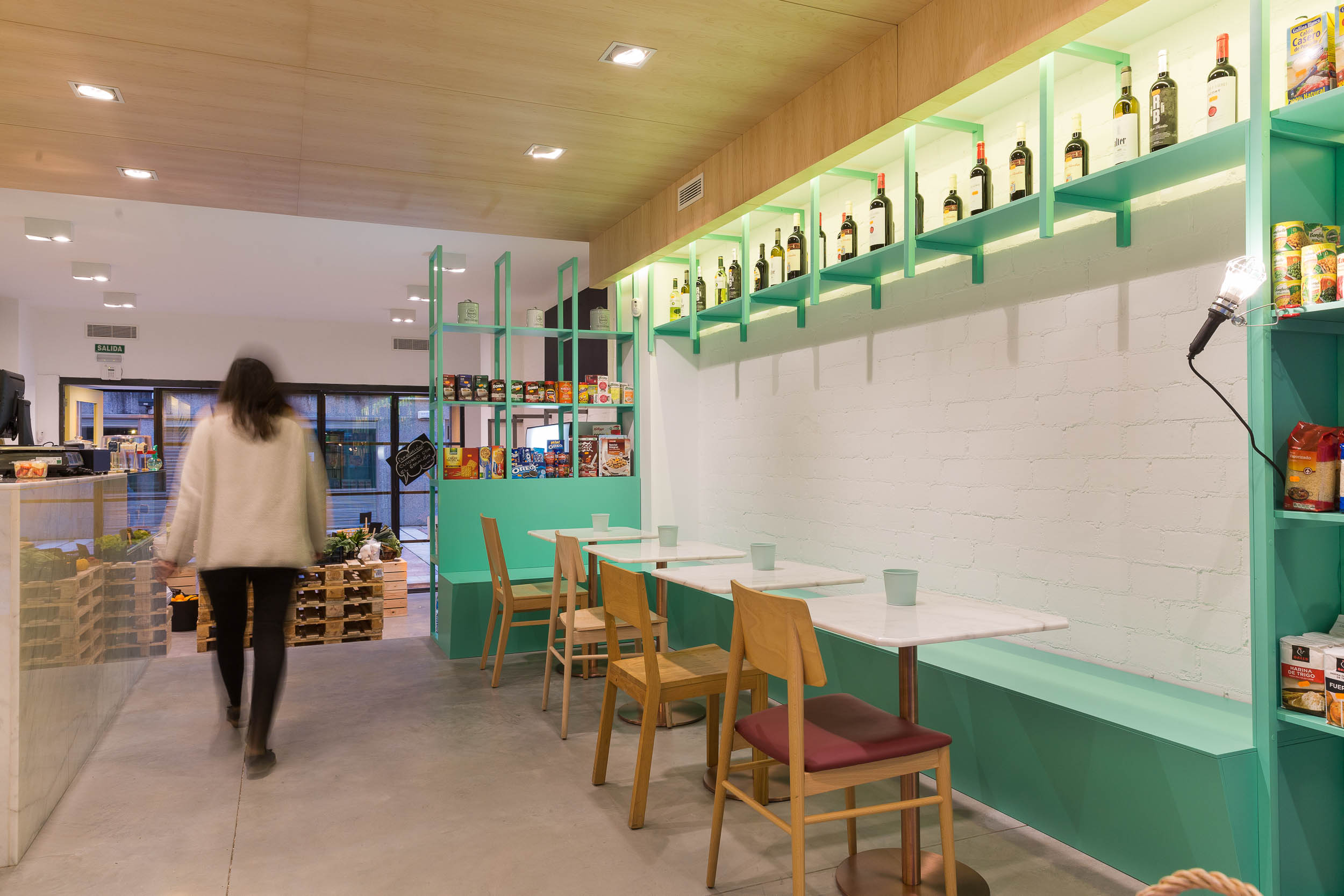 El local se divide en 2 áreas muy diferenciadas, una de frutería y otra de tienda ambas conectadas por una bancada con mesas donde poder degustar cualquiera de sus productos. El uso de maderas claras, lacados en color verde, mármol blanco, suelo de hormigón…etc. No pretende otra cosa que llevarnos a la tienda de nuestro pueblo a la que íbamos de la mano de nuestras abuelas.