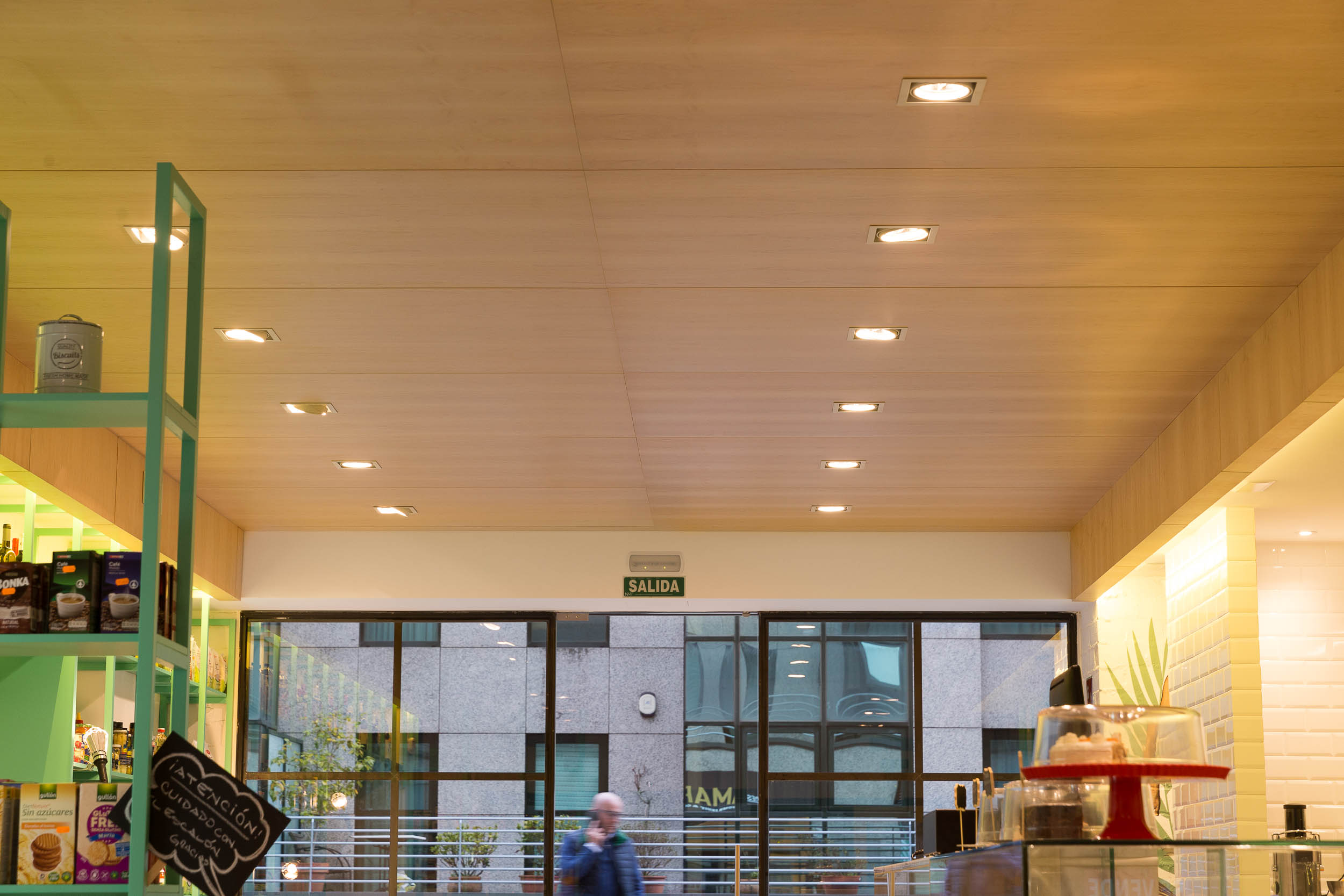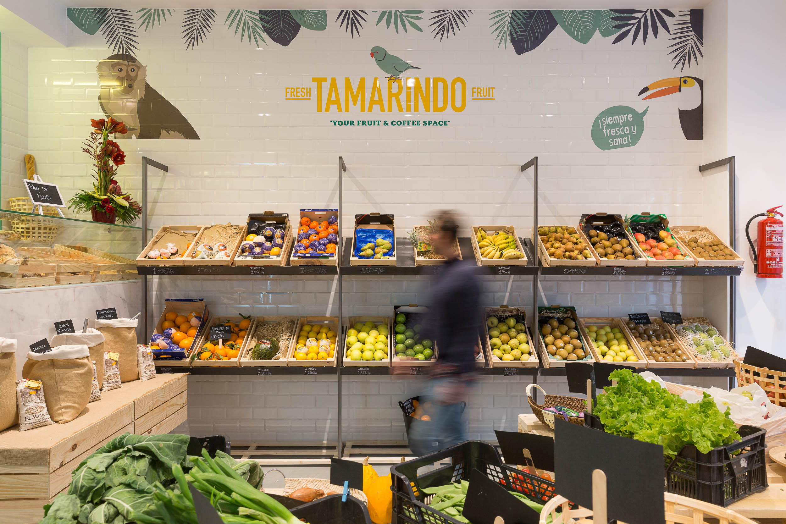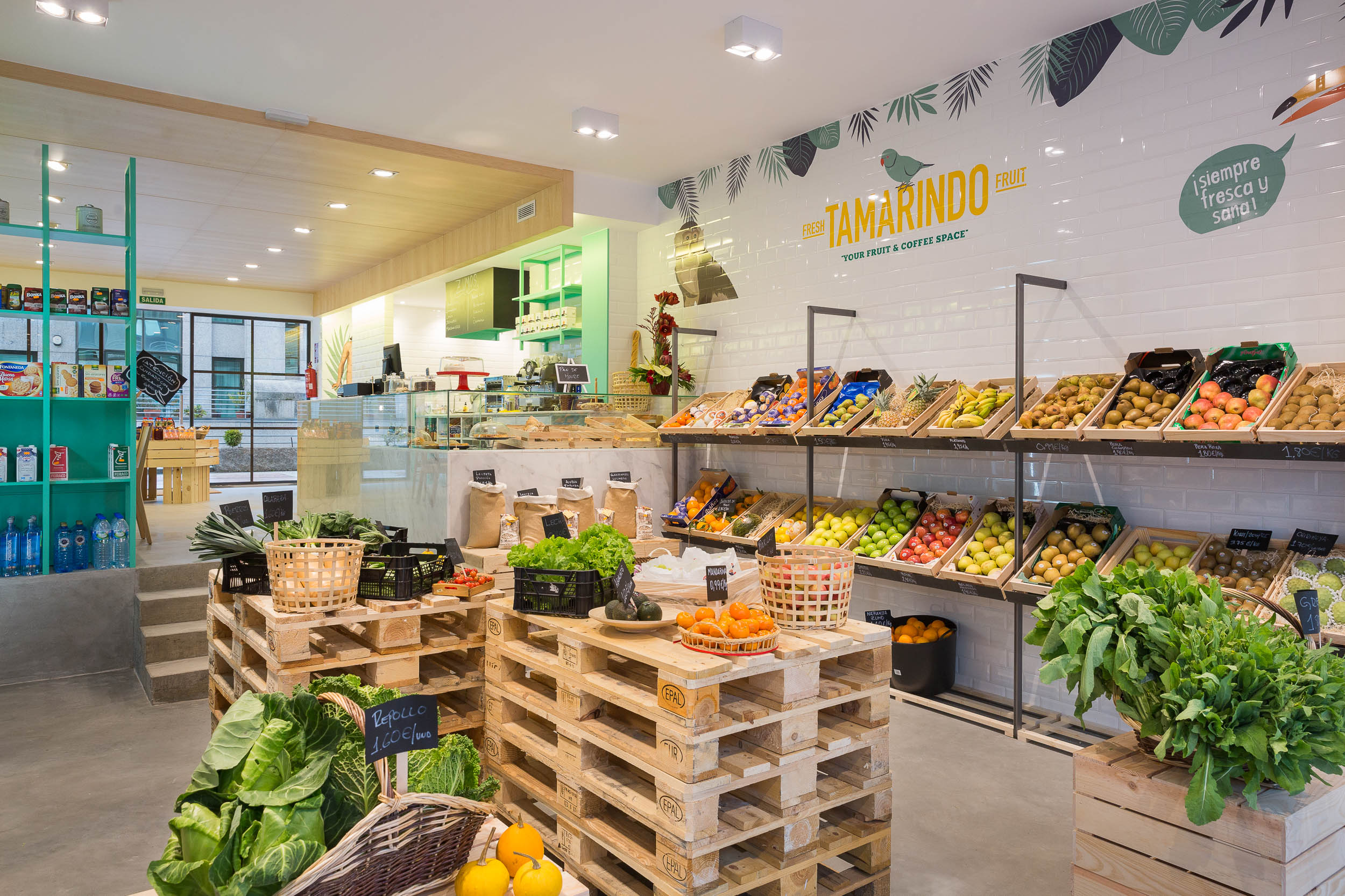 El local se divide en 2 áreas muy diferenciadas, una de frutería y otra de tienda ambas conectadas por una bancada con mesas donde poder degustar cualquiera de sus productos. El uso de maderas claras, lacados en color verde, mármol blanco, suelo de hormigón…etc. No pretende otra cosa que llevarnos a la tienda de nuestro pueblo a la que íbamos de la mano de nuestras abuelas.